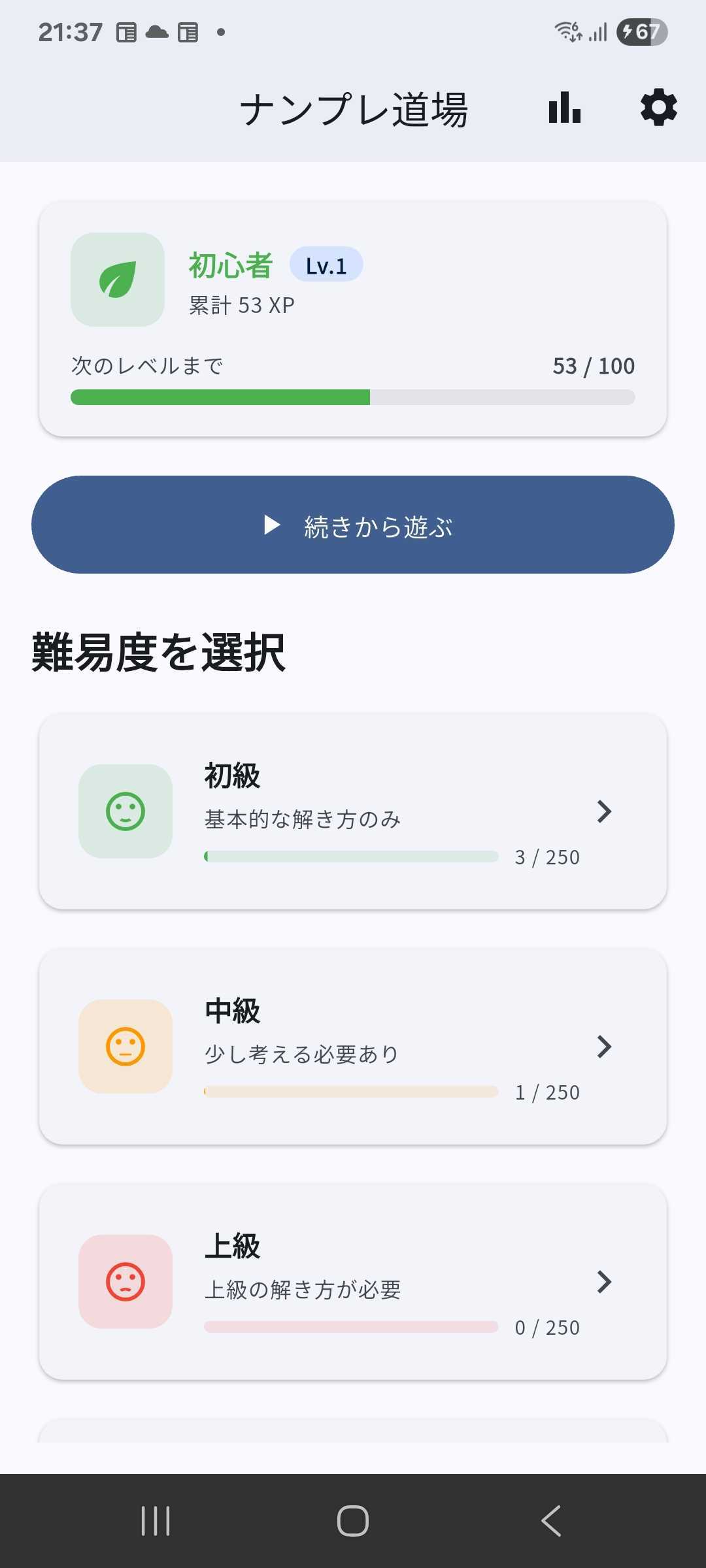 レベル・ランクシステムでは、パズルをクリアするたびに経験値を獲得し、レベルが上がっていきます。「見習い」からスタートし、「初段」「二段」と昇段していき、最終的には「師範代」まで到達できます。